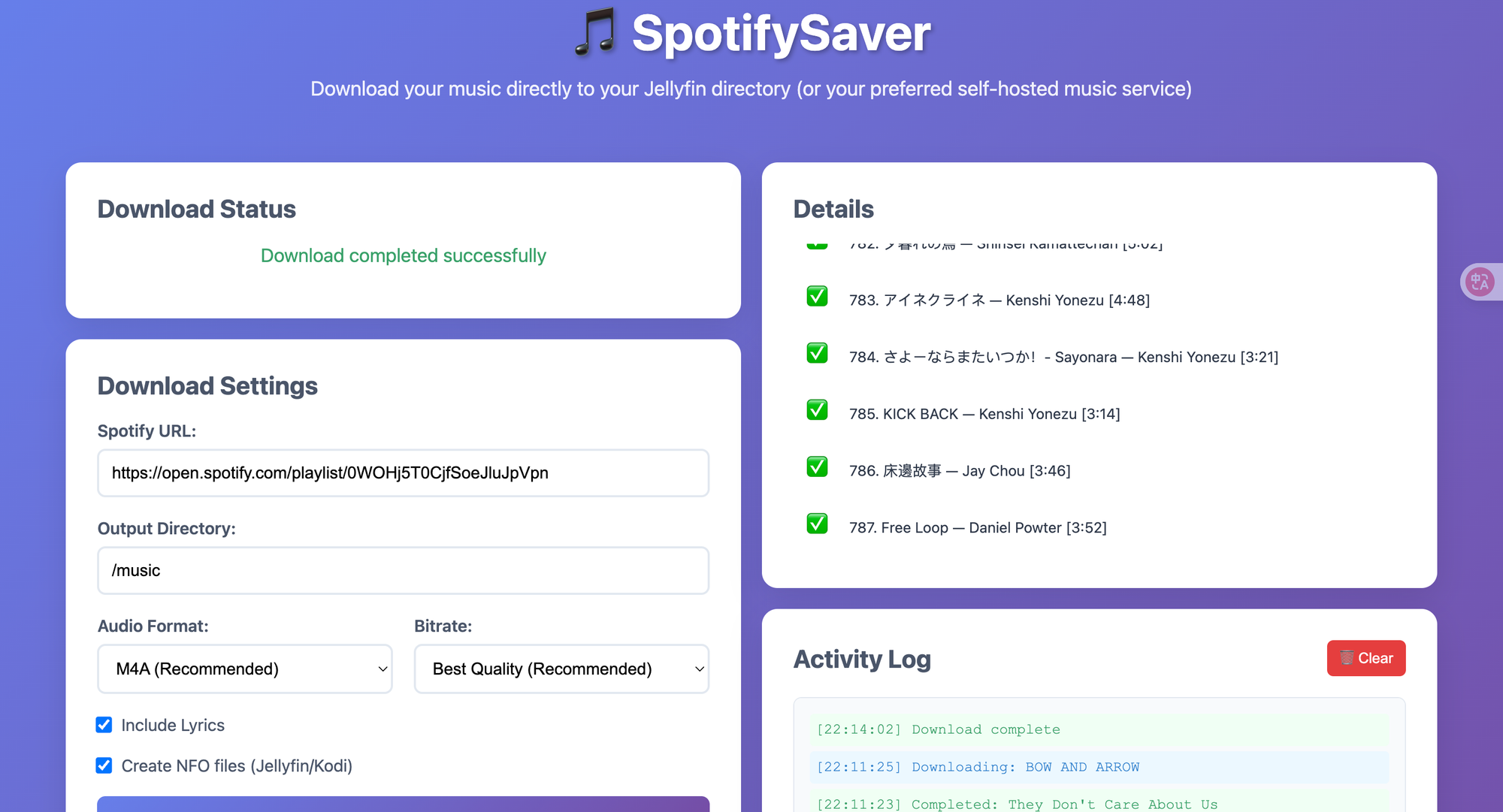 如图,话费一个小时,为我下载好了787首歌曲在~/docker/downloader/spotify-saver/music 下,以艺术家为分类目录