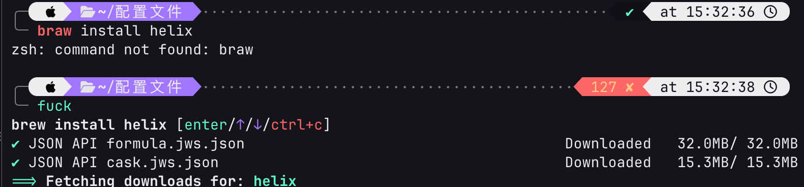 code ~/.zshrc,尾行加上eval $(thefuck --alias)
